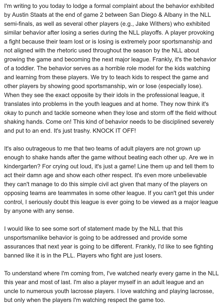 NCAA men's lacrosse has to increase the length of penalties. 1 min for a blatant illegal body check is just silly. It's a slap on the wrist. That would be 5 min in NLL.